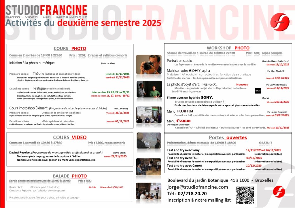 En photographie, nous vous proposons des cours d’initiation (Français et Néerlandais), des workshops spécialisés et des cours de retouche photo. À propos de vidéographie nous offrons des cours pour apprendre à filmer avec votre caméra vidéo et des cours de montage vidéo.